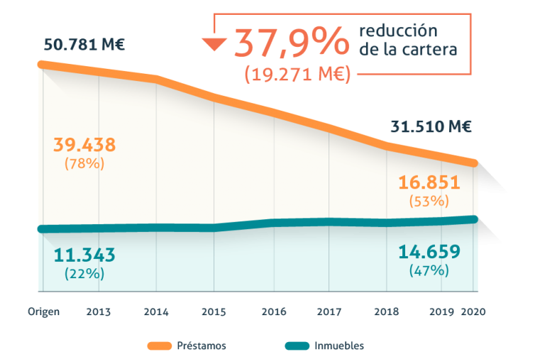 Paso a paso estamos liquidando nuestros activos. En estos 8 años de trabajo hemos logrado reducir nuestra cartera en 19.271 millones de euros, un 37,9%. Y, a la vez, seguimos transformando préstamos en inmuebles (viviendas, suelos, oficinas, naves…), que son más fáciles de vender.